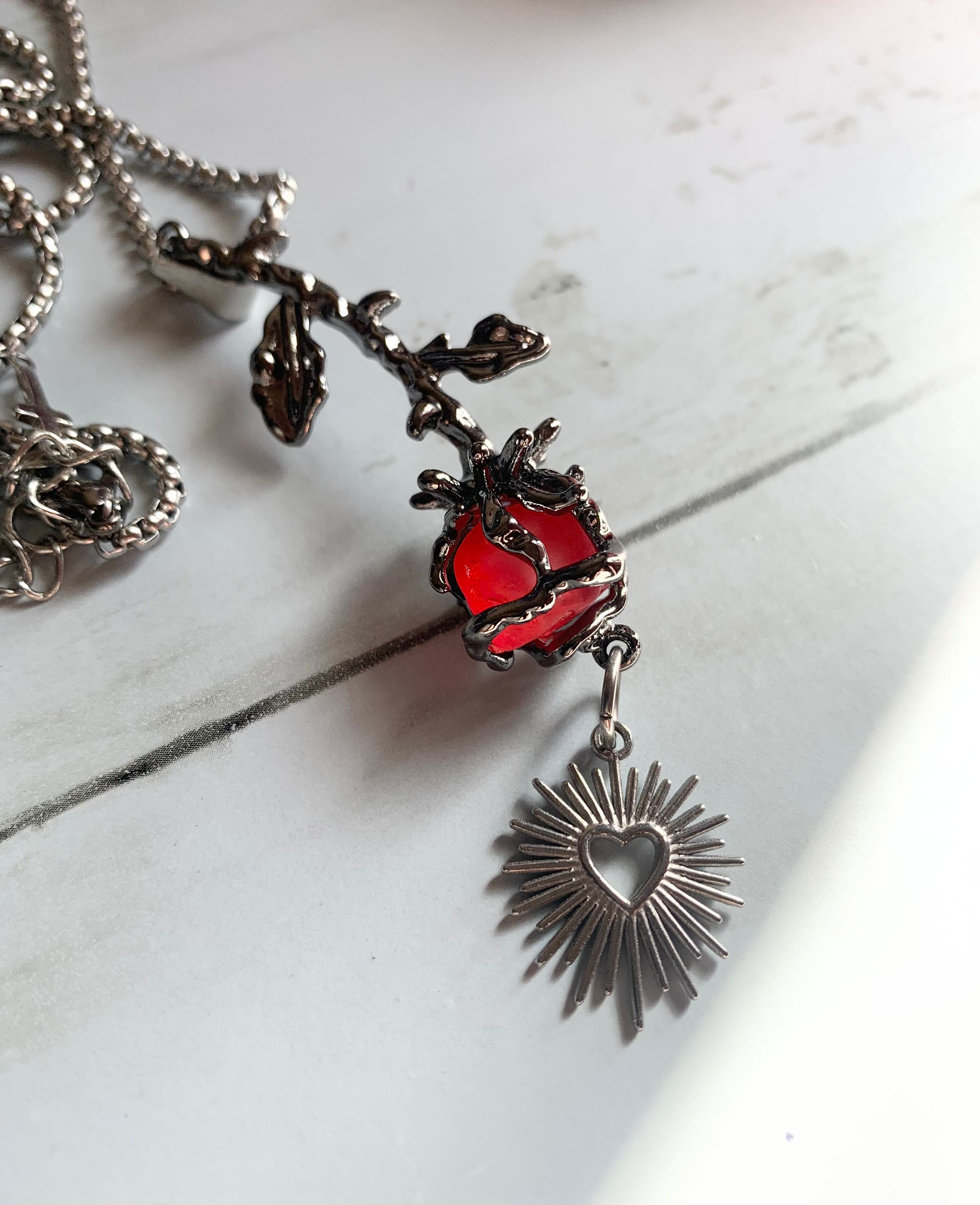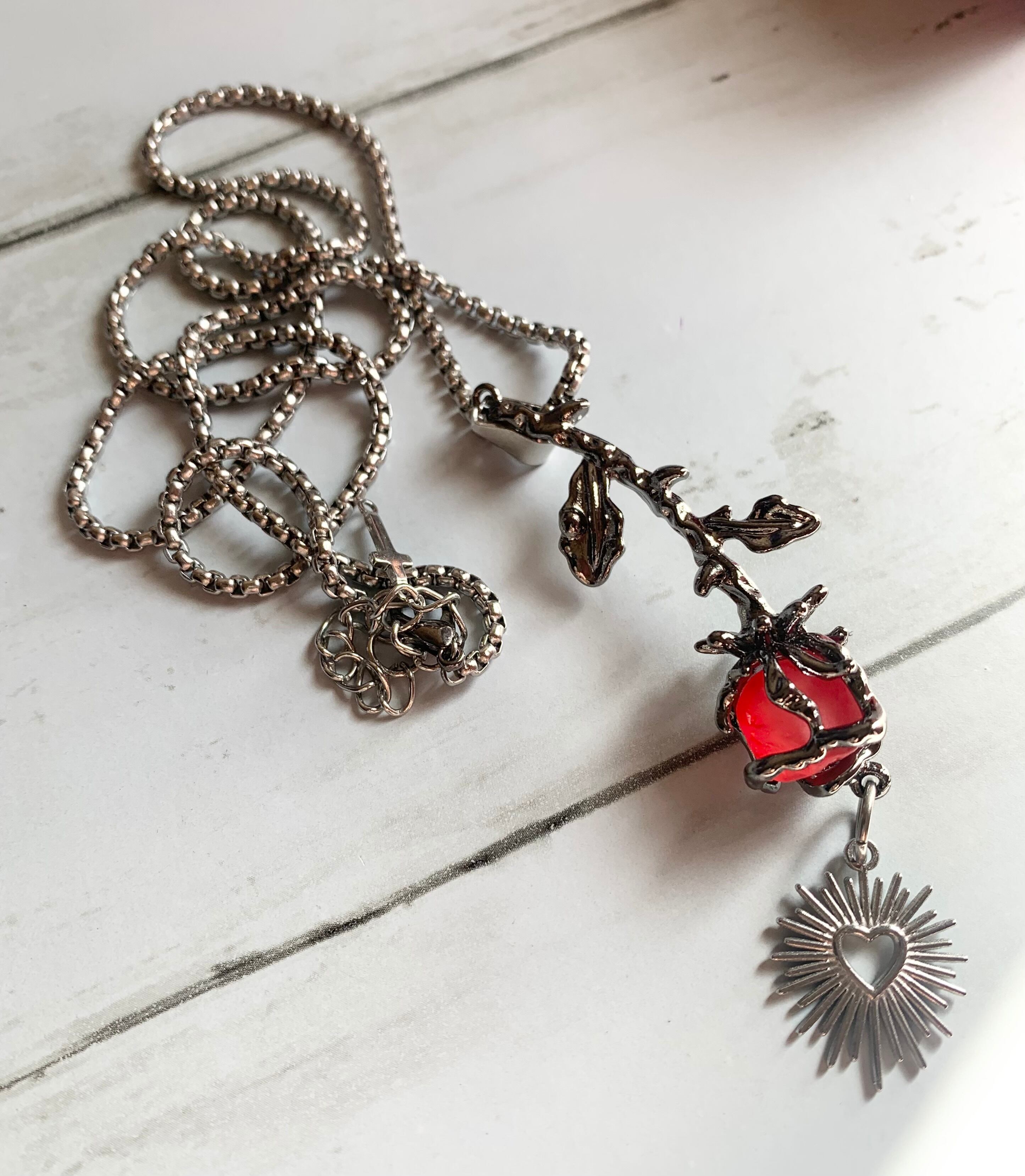 金属アレルギーには対応しておりませんのでご注意ください。脱着は首の方ではなく、両方のチャームの方に脱着パーツが付いていますのでそちらから脱着して下さい。