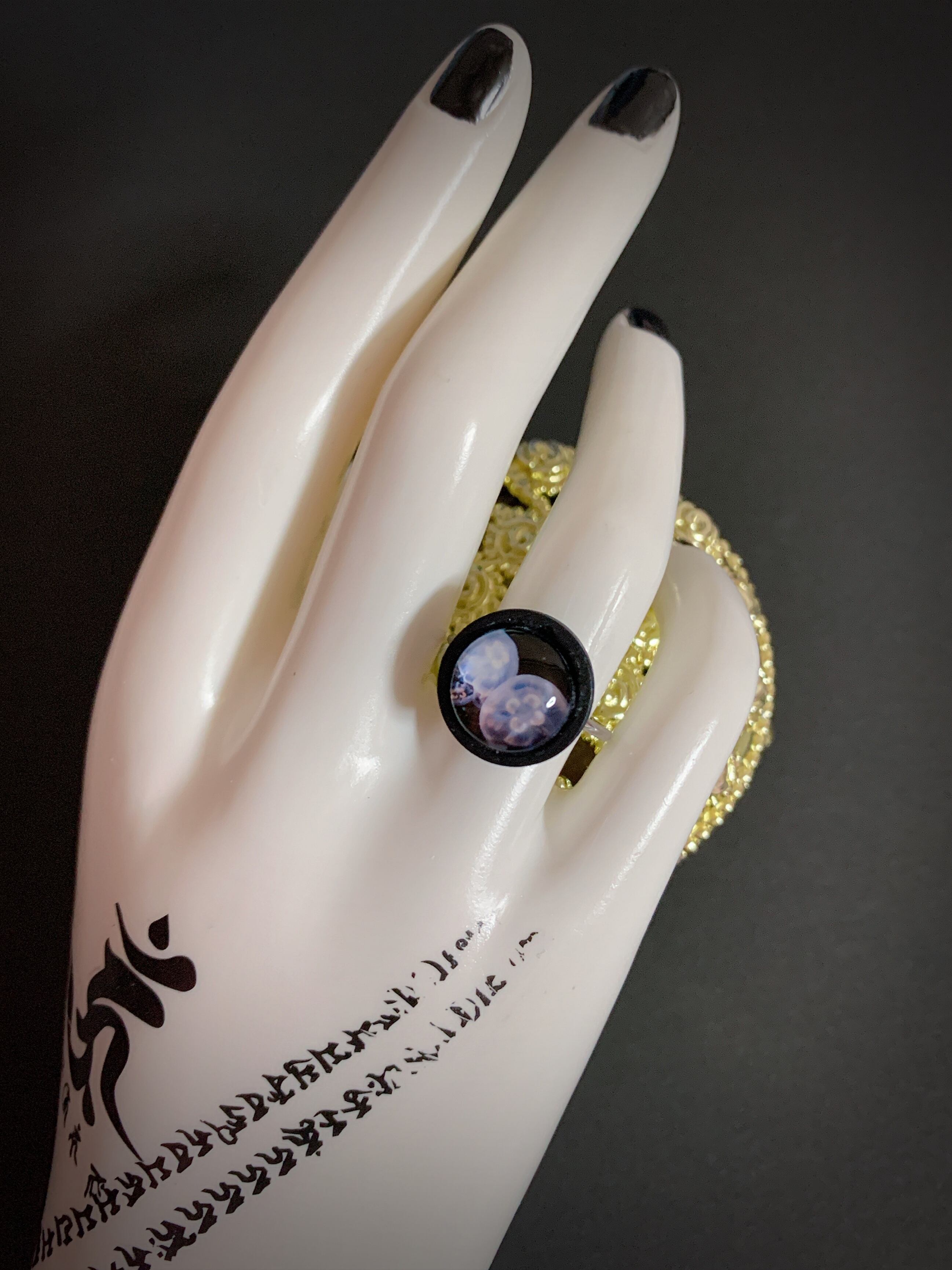 小さな水族館のような幻想的なクラゲの実写ガラスカボションリングです。指でくらげを飼えますよ。